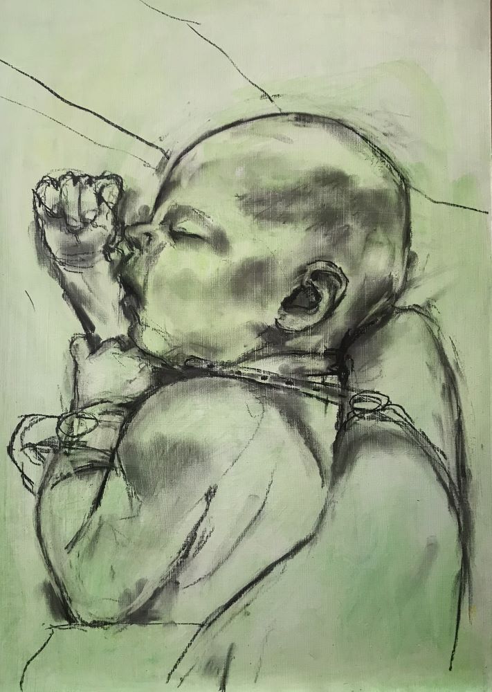 Though the previous stage had an accuracy and drama to it, there was a darkness in the background and overall that did not suit the subject. I experimented with a series of changes to colour of the sheet and in the top right corner, then lifted the tonal value across the piece to give it a greater overall lightness. I left the mother and the background unresolved so that the baby holds the focus.
