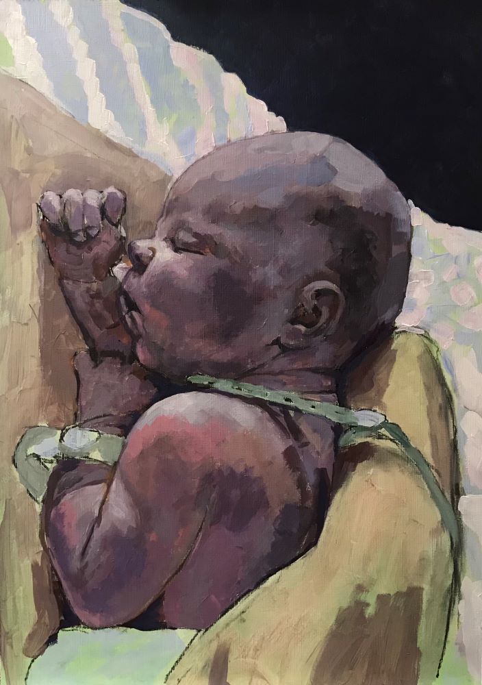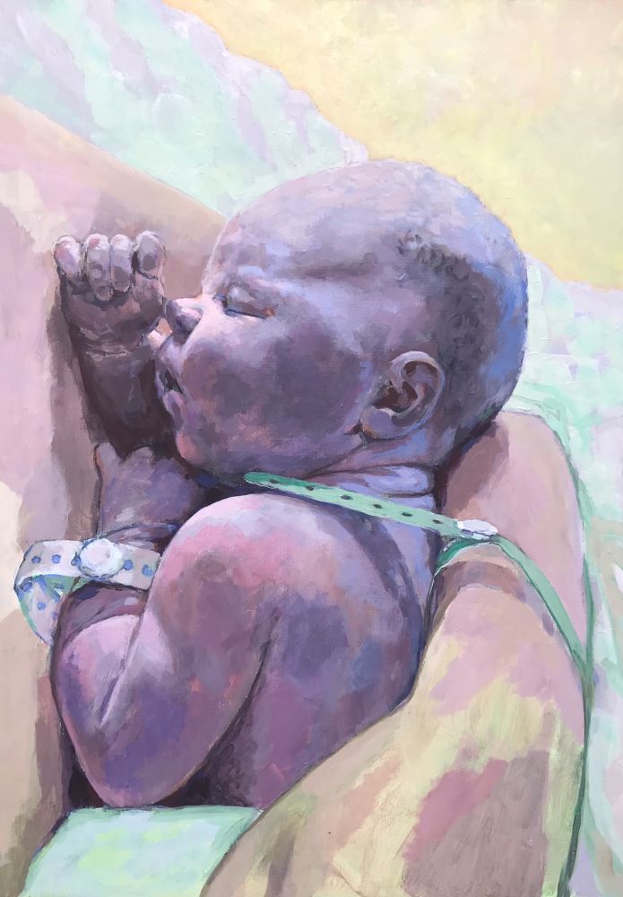 Using acrylics, I then blocked in the main colours, giving particular attention to the baby itself and holding back on the surrounding features: the mother’s arm and chest, the sheet, the background. I discovered at this stage that the two hospital bands, which I had intended to paint out, gave a particular poignancy to the picture.